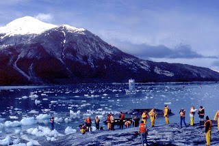 “The scenery here becomes even grander than before. The lofty mountains on the north side compose the granitic axis, or backbone of the country, and boldly rise to a height of between three and four thousand feet, with one peak above six thousand feet. They are covered by a wide mantle of perpetual snow, and numerous cascades pour their waters, through the woods, into the narrow channel below. In many parts, magnificent glaciers extend from the mountain side to the water's edge. It is scarcely possible to imagine anything more beautiful than the beryl-like blue of these glaciers, and especially as contrasted with the dead white of the upper expanse of the snow. The fragments which had fallen from the glacier into the water, were floating away, and the channel with the icebergs presented, for the space of a mile, a miniature likeness of the Polar Sea.”